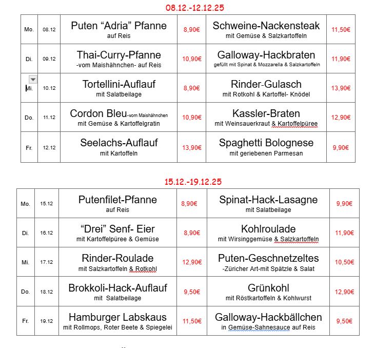 Unser Küchenteam kreiert jeden Tag frische und leckere Gerichte, die aus den besten Zutaten zubereitet werden. Von herzhaften Eintöpfen über Suppen, Salaten und Aufläufen bis hin zu deftigen Hauptgerichten bieten wir eine abwechslungsreiche Auswahl für jeden Geschmack.